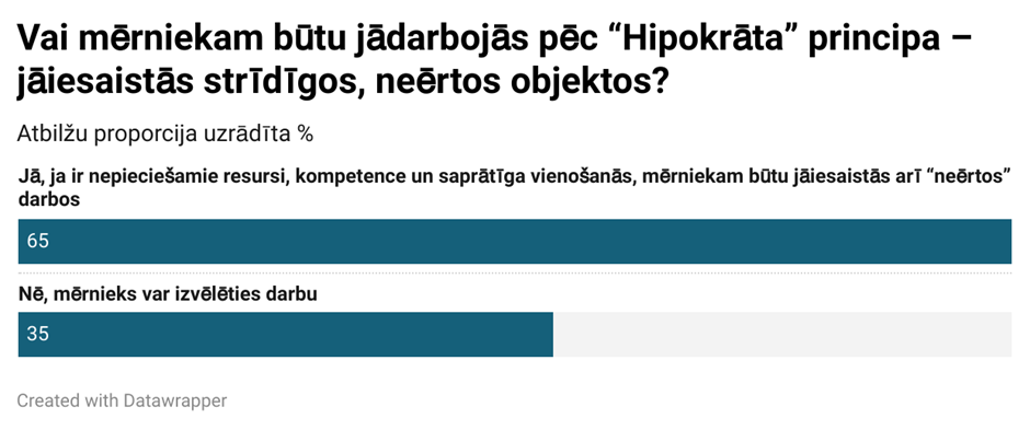 Aptaujā par mērnieka iesaisti sarežģītos un ar iespējamiem konfliktiem saistītos objektos dominē pozitīvs skatījums – ja ir zināšanas, resurss un saprātīga vienošanās, lielākā daļa uzskata, ka profesionālim jāpiedalās situāciju risināšanā.