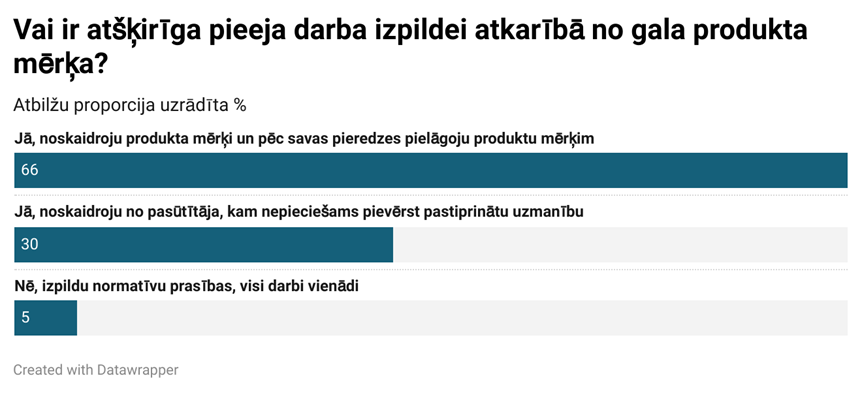 Vienlaikus aptaujas atklāja, ka atšķirīga pieeja bieži tiek izmantota atkarībā no gala produkta mērķa – mērnieki cenšas noskaidrot, kur un kam dati tiks izmantoti, un attiecīgi pielāgot darbu. Tas liecina par profesionālu attieksmi pret rezultātu, nevis formālu normatīvu izpildi.